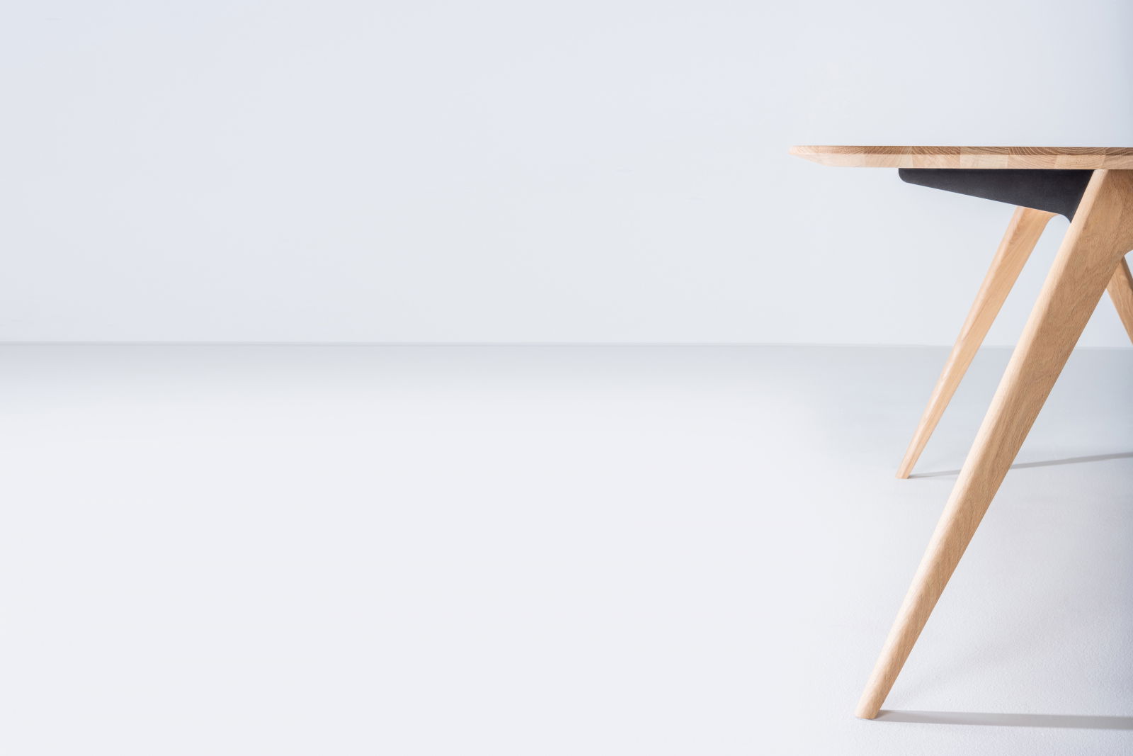The table rocks a unique, A-shaped construction connected to a slender, solid wooden top. Clean cuts are countered with smooth lines, and wooden elements are elegantly reinforced with steel – providing harmony and an iconic sort of grace.