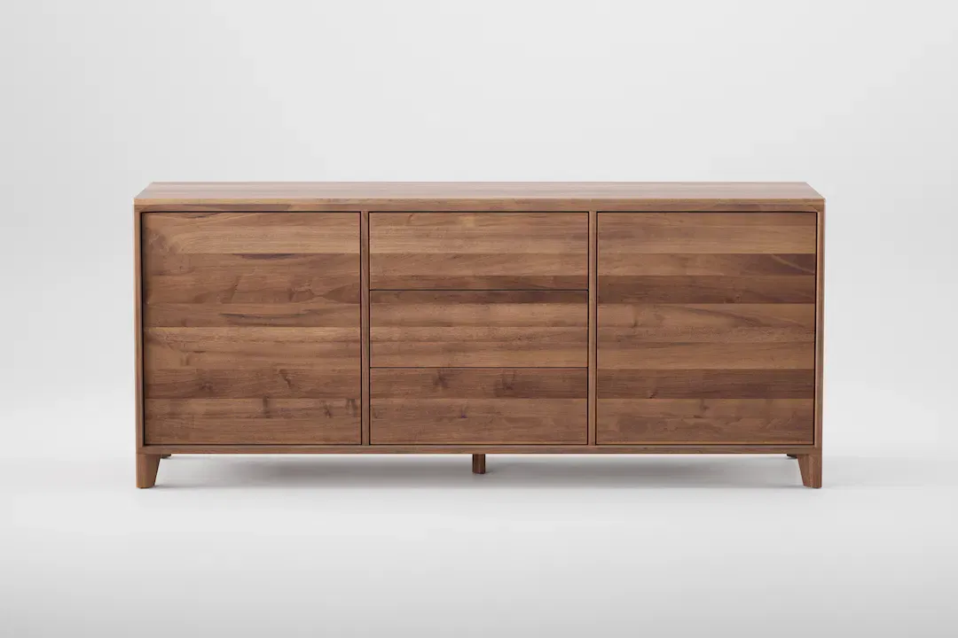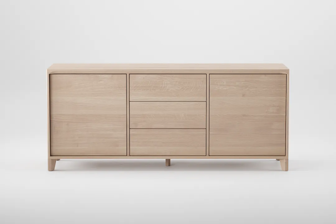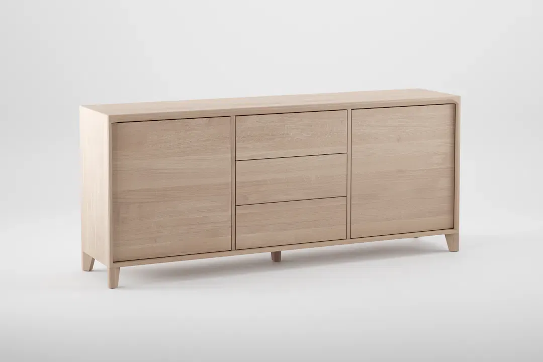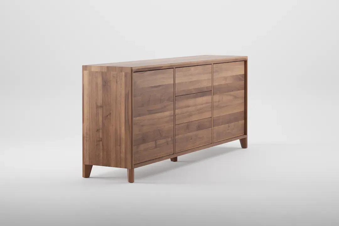 Hanny High Sideboard by Artisan made of solid wood by expert craftsmen. Composed of 2 side doors and 3 central drawers, it is solid and functional. Ideal for your living area, it is available in 3 different sizes and various fine wood finishes.